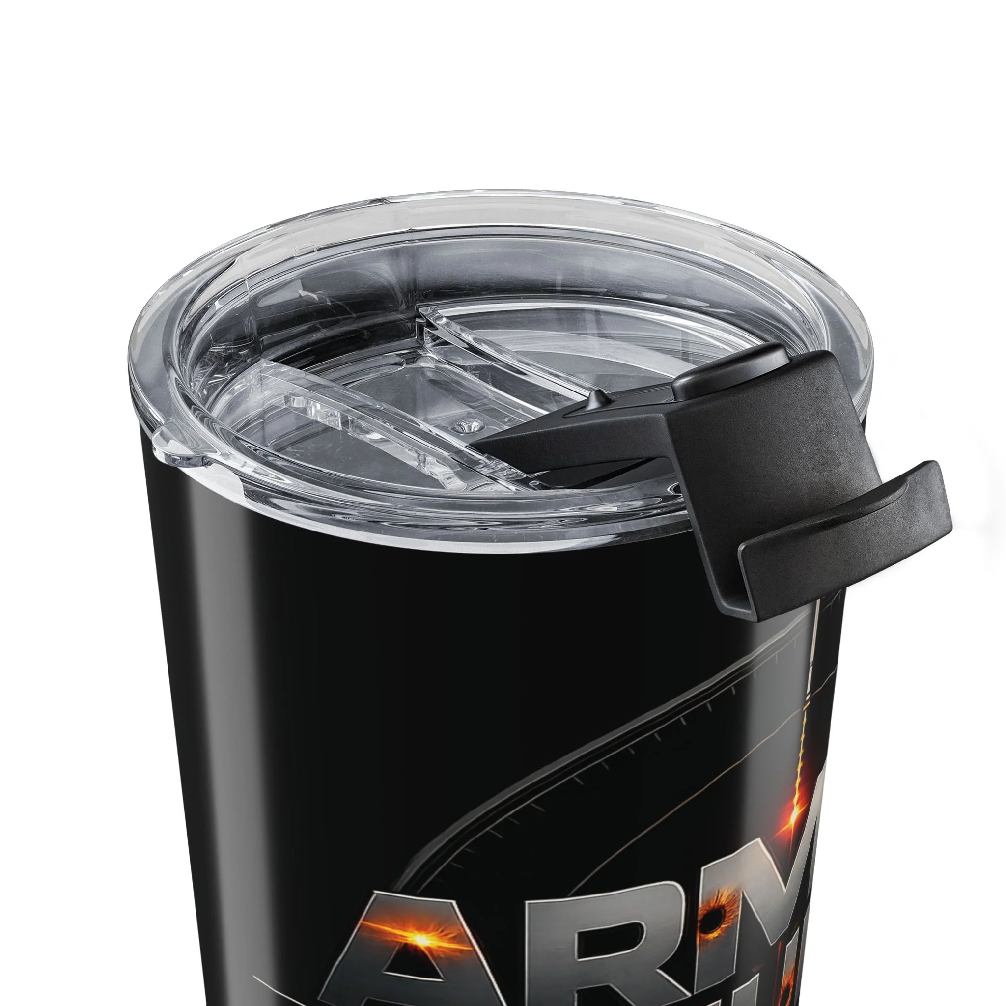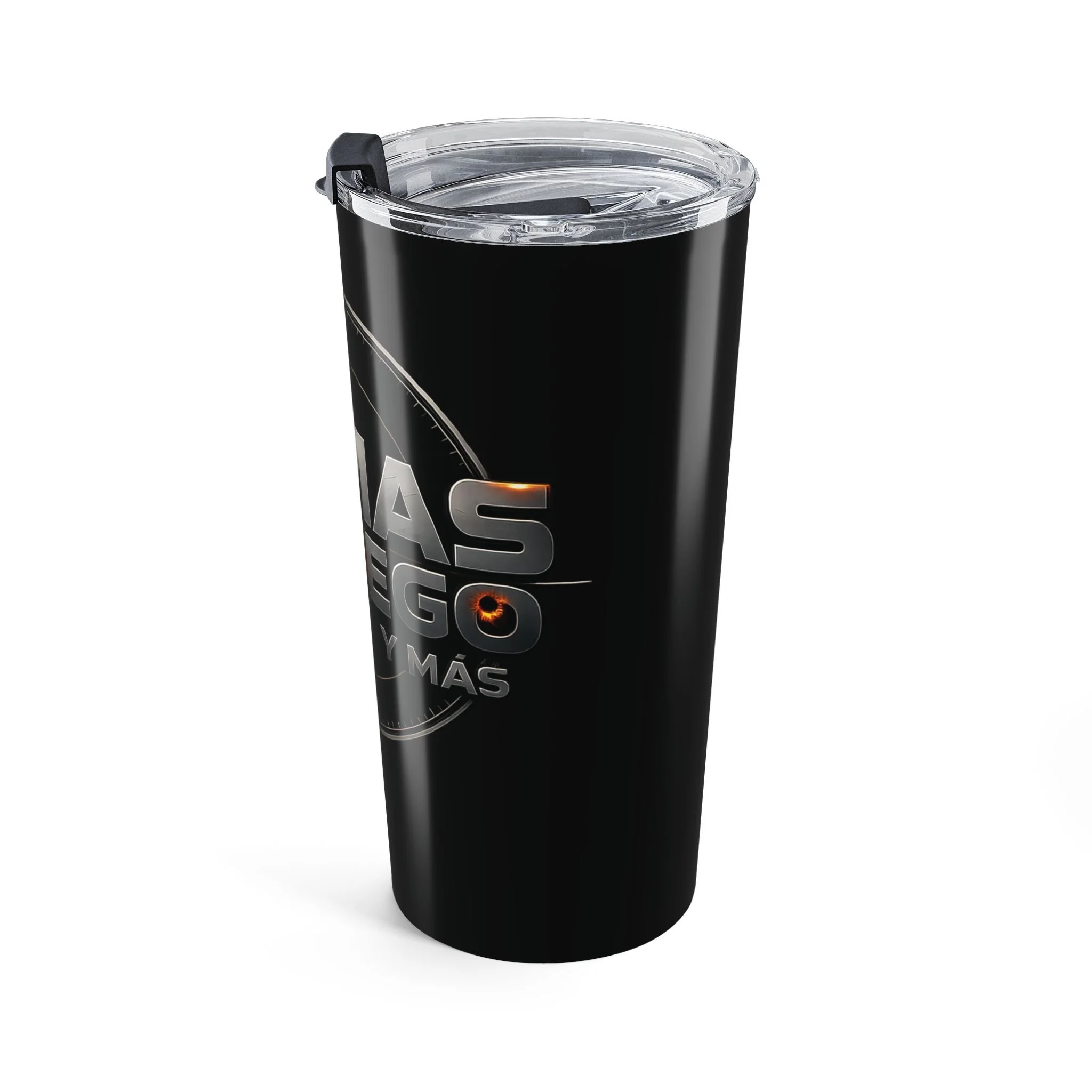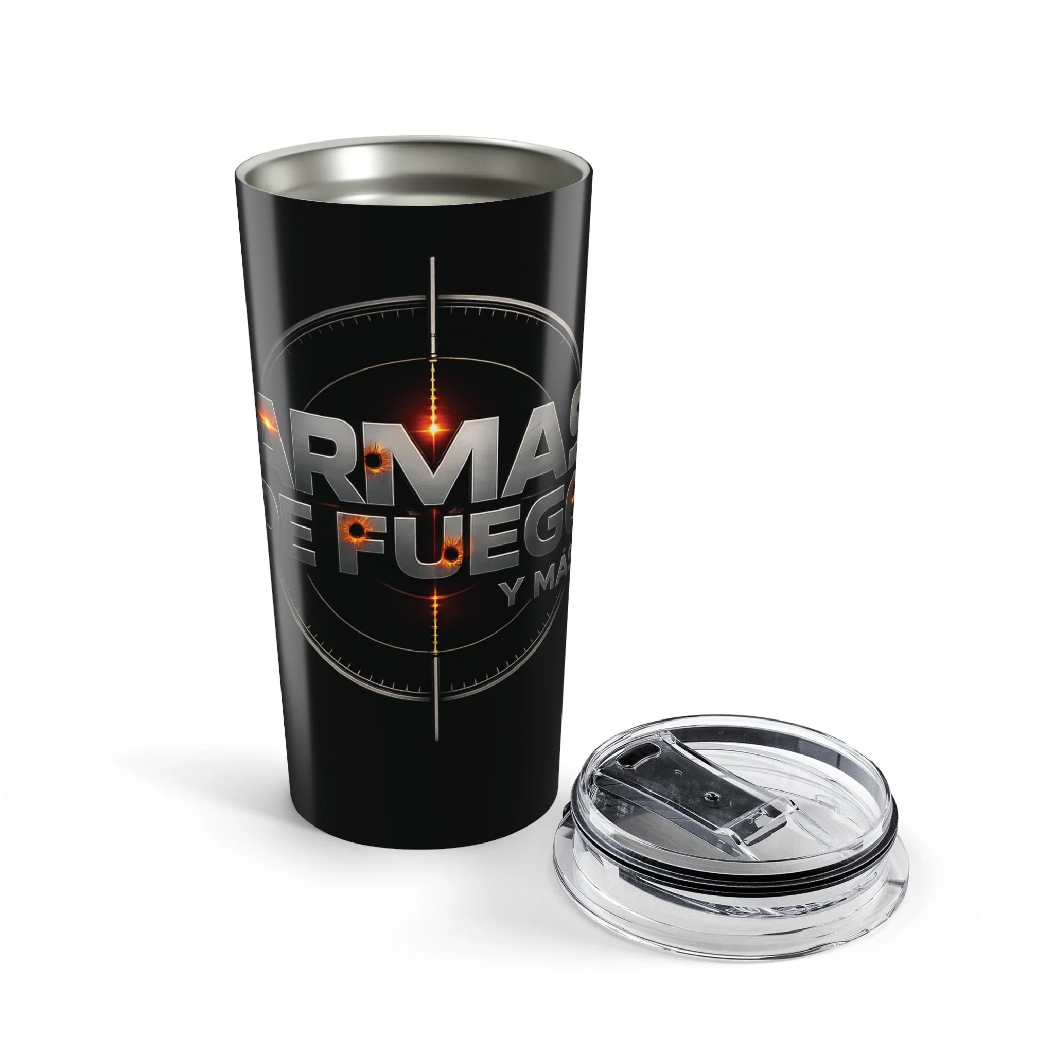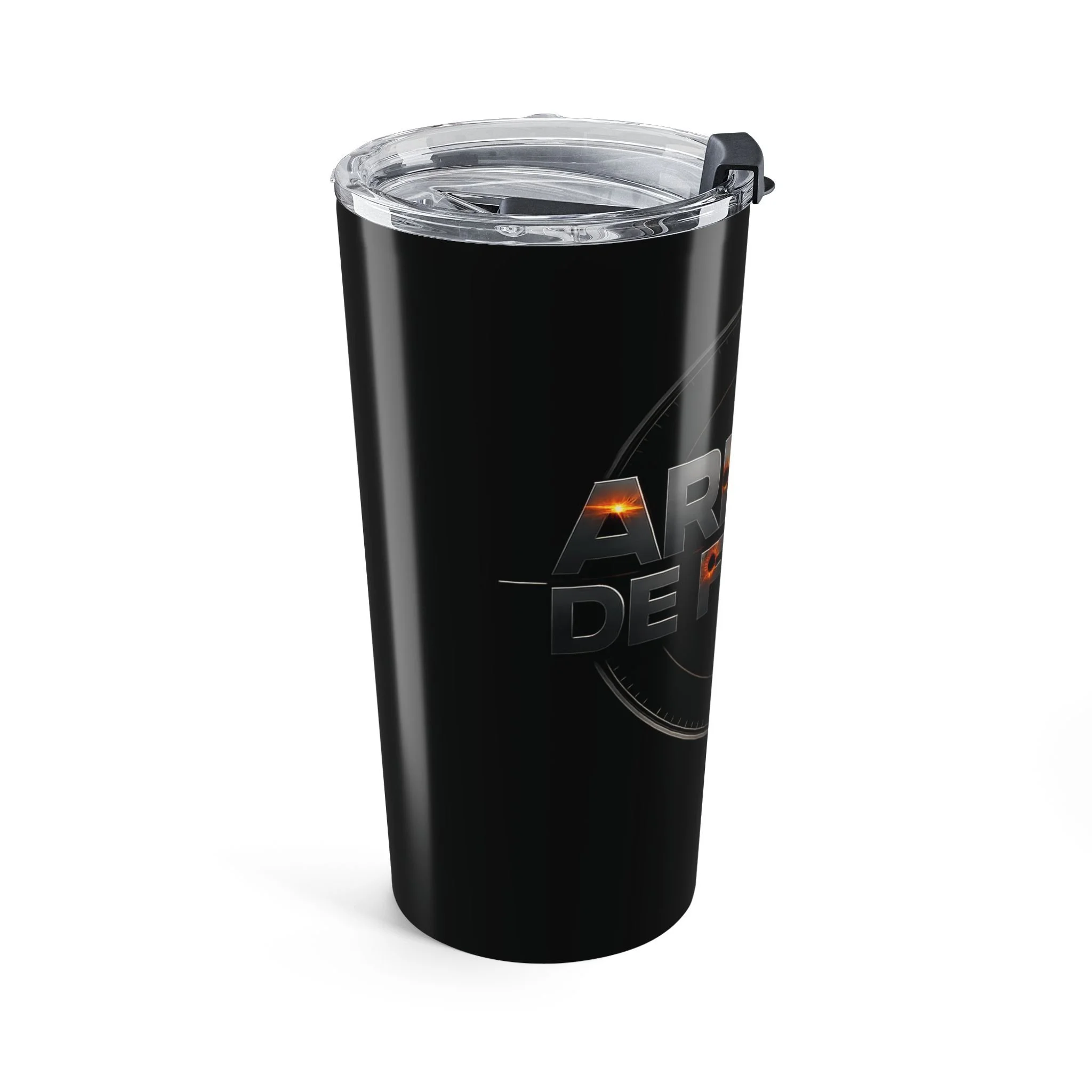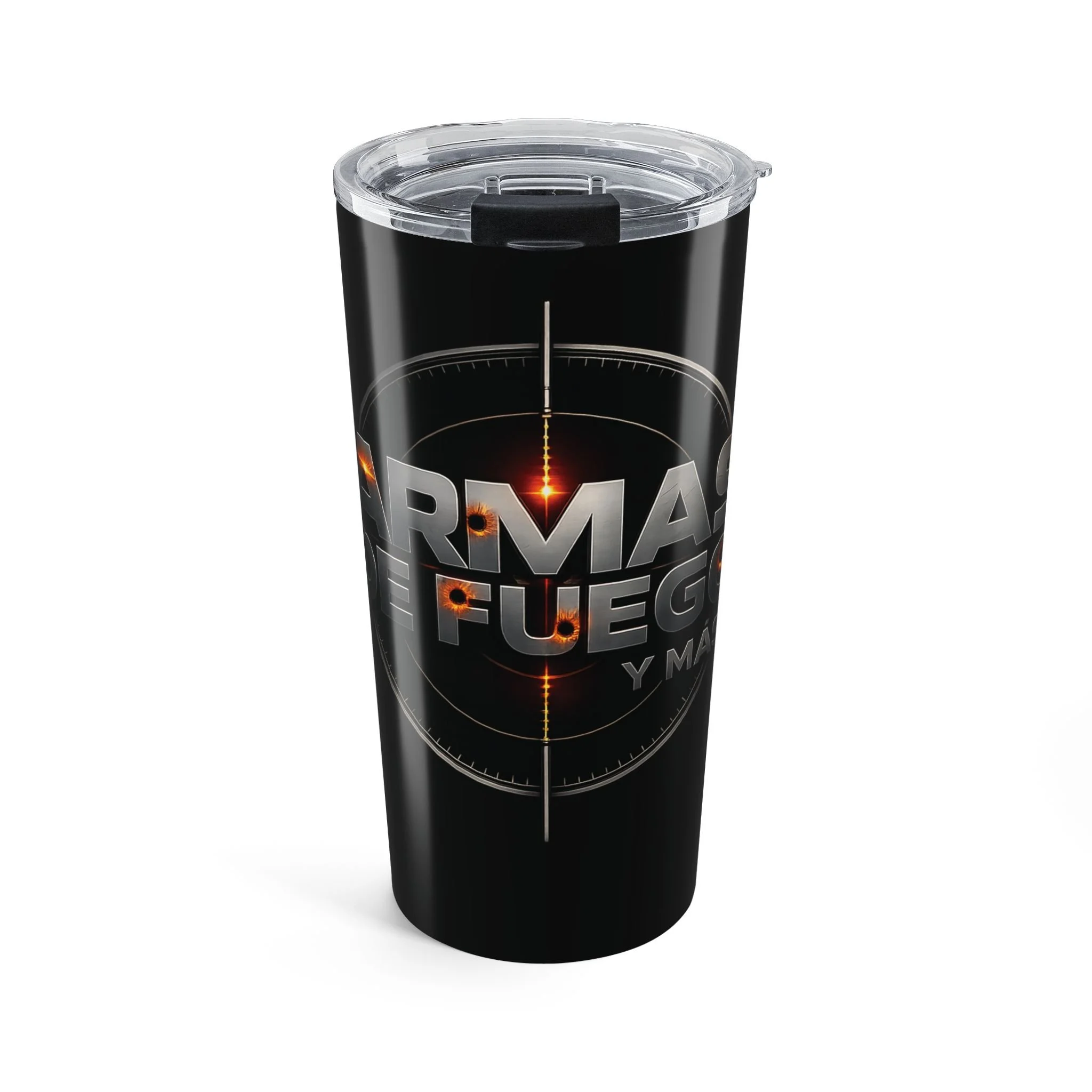 Black stainless steel 20oz tumbler with a glossy, wraparound print that reads like a mission patch—bold lettering, crosshair accents, and a subtle ember glow. It feels weighty and precise in the hand, built to go from morning commute to late-night studio sessions without losing temperature. The clear push-on lid with a rubber gasket seals tightly for sip-and-go moments, while the vacuum-insulated double-wall keeps coffee hot or iced drinks cold for hours. This tumbler sits comfortably in cup holders, slips into backpacks, and looks like it belongs in creative, focused routines—whether you’re sketching at a desk, running errands, or powering through a long practice.