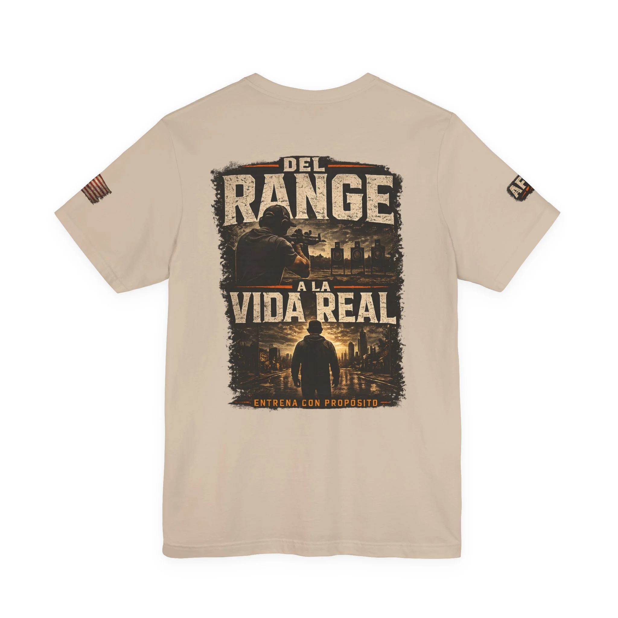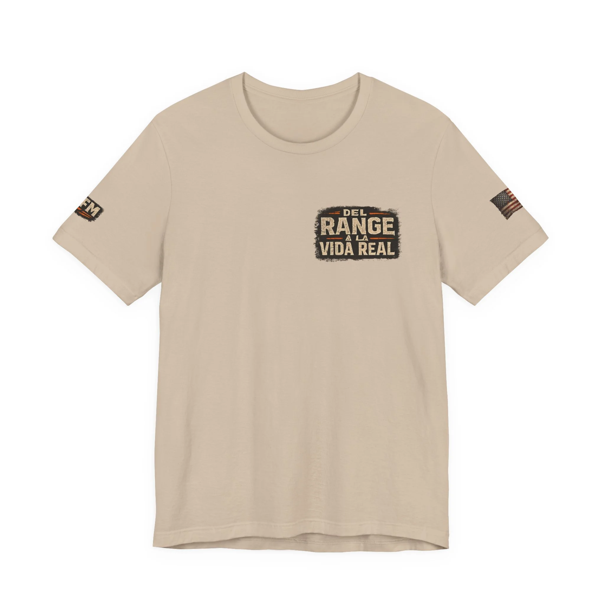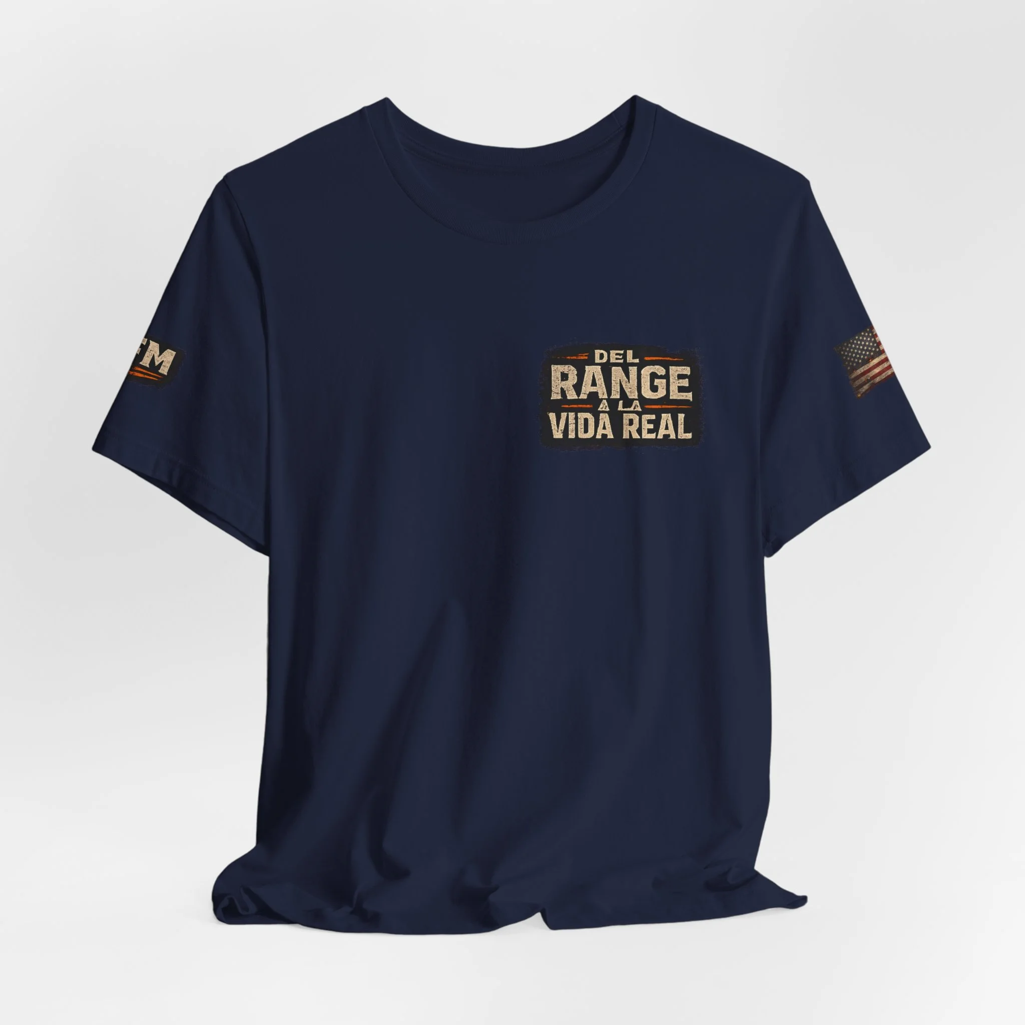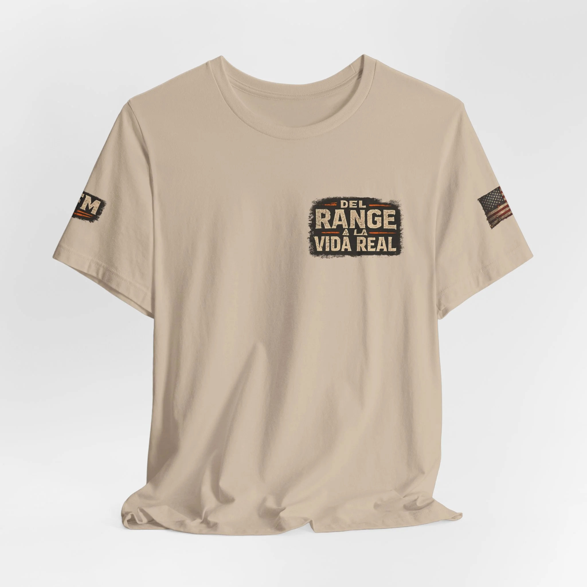 A lightweight, statement tee that feels lived-in from the first wear. This crew-neck shirt is made from soft Airlume combed and ring-spun cotton with side seams and a ribbed knit collar for lasting shape. The front and back carry a rugged, cinematic design — Spanish text layered over silhouette scenes — that reads like a pledge to real life beyond the range. Subtle sleeve accents and a tear-away label keep comfort and utility at the forefront. Wear it layered under a jacket or on its own when you want clothing that speaks plainly and carries a story.