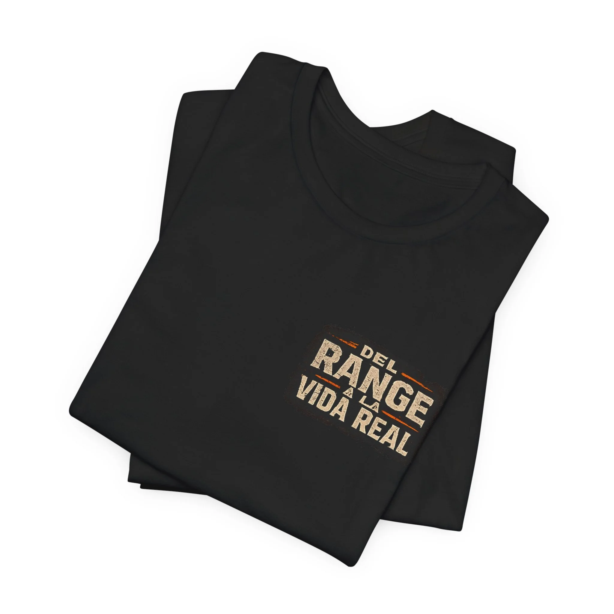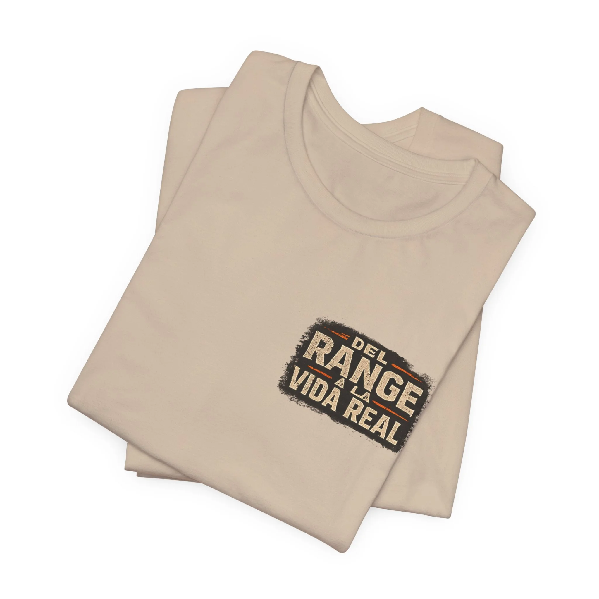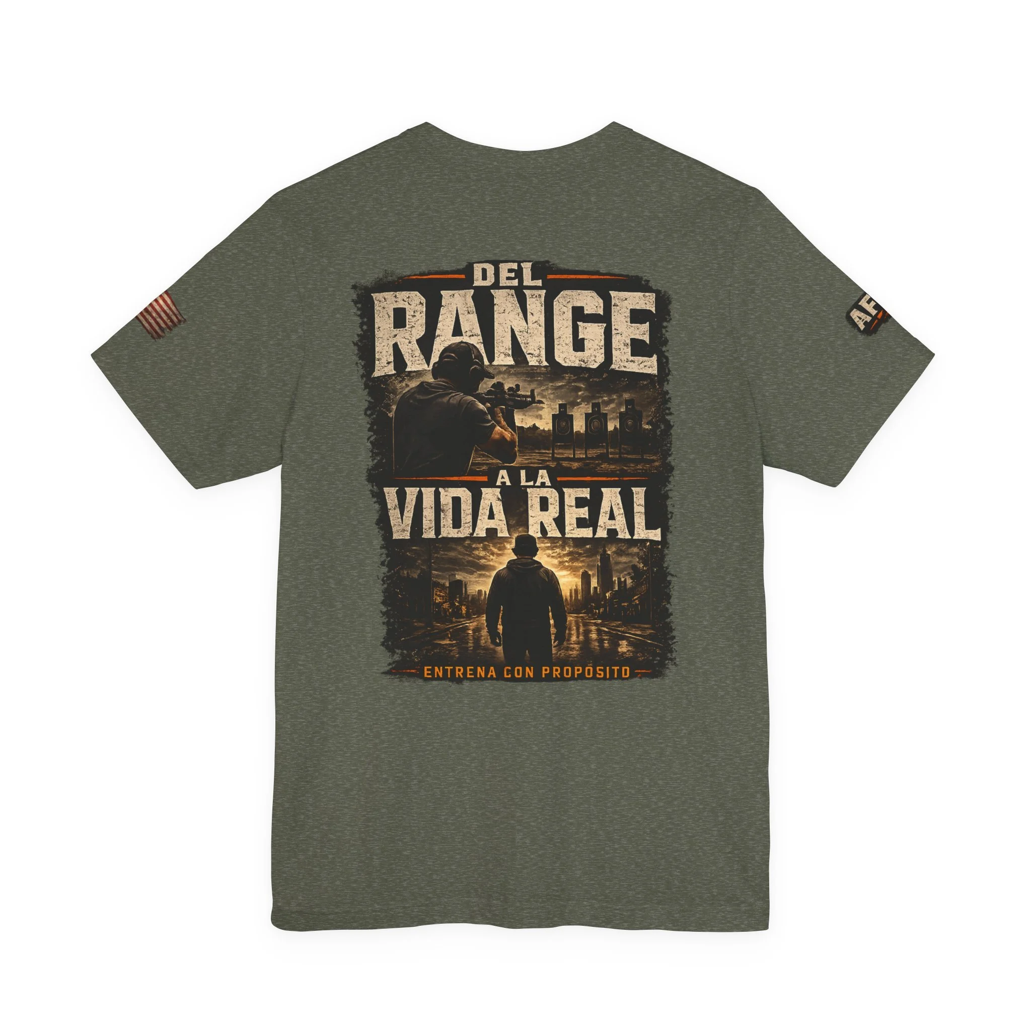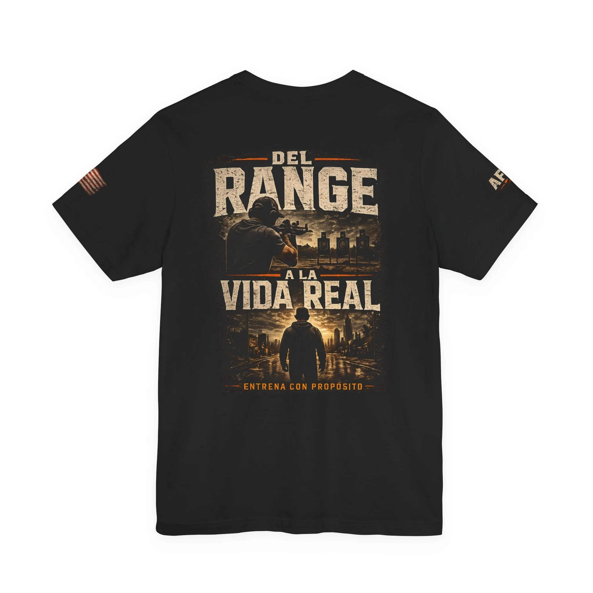 A lightweight, statement tee that feels lived-in from the first wear. This crew-neck shirt is made from soft Airlume combed and ring-spun cotton with side seams and a ribbed knit collar for lasting shape. The front and back carry a rugged, cinematic design — Spanish text layered over silhouette scenes — that reads like a pledge to real life beyond the range. Subtle sleeve accents and a tear-away label keep comfort and utility at the forefront. Wear it layered under a jacket or on its own when you want clothing that speaks plainly and carries a story.